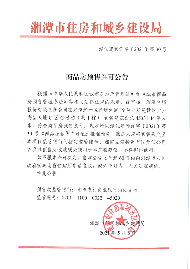 關(guān)于步步高新天地C區(qū)G號(hào)棟(共1棟)預(yù)售許可公告
