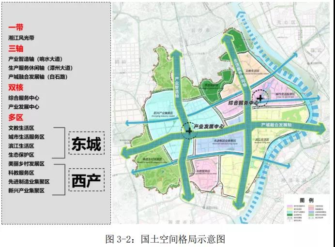 “三軸”:沿響水大道的產(chǎn)業(yè)智造軸、沿潭州大道的生產(chǎn)服務(wù)休閑軸和沿白石路的綜合聯(lián)動(dòng)發(fā)展軸。