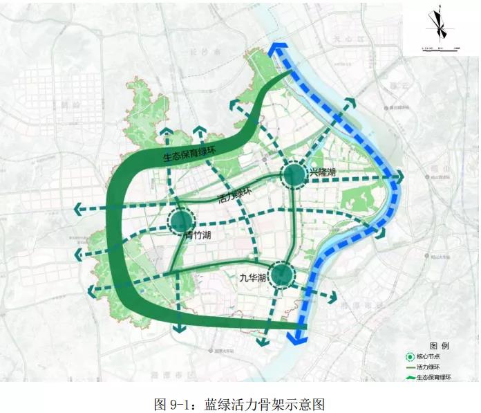 規(guī)劃構(gòu)建“雙環(huán)多廊”的藍(lán)綠骨架,讓藍(lán)綠空間更有價(jià)值,更有活力!半p環(huán)”主要包括內(nèi)部的活力綠環(huán)和外部的保育綠環(huán)!岸嗬取敝饕陕『幕鷳B(tài)公園、青竹湖休閑文化公園以及九華公園三大城市綜合公園向外發(fā)散形成多條景觀廊道。