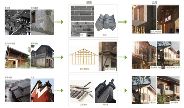 由魯班殿、李劉柒堂提煉灰磚灰瓦元素;由窯灣老街提煉出斜撐木構(gòu)元素;由文廟提煉正脊正吻和馬頭墻元素。這些街區(qū)細(xì)節(jié)設(shè)計(jì),為商業(yè)街區(qū)添加特色魅力。