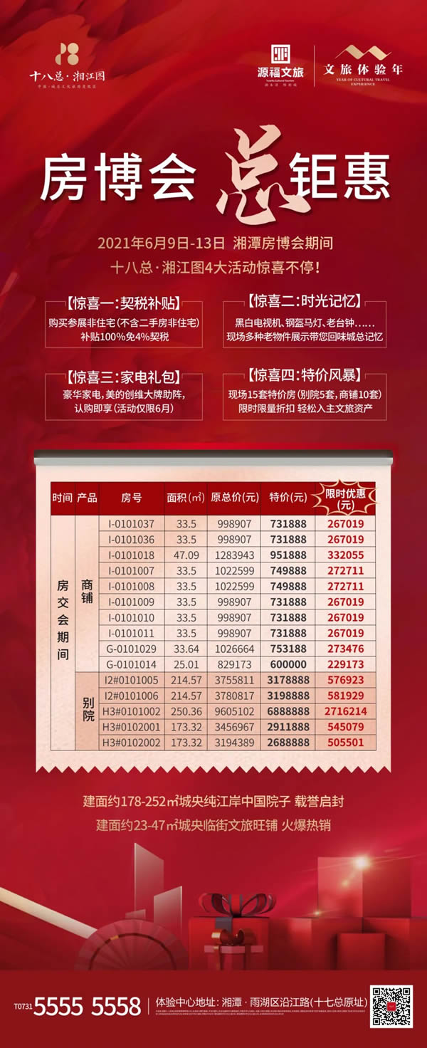 6月9日—13日,2021年湘潭市房地產(chǎn)交易博覽會(huì)將在東方紅廣場(chǎng)舉行,十八總·湘江圖,作為湘潭地標(biāo)性質(zhì)的文旅代表項(xiàng)目,也將攜多重優(yōu)惠出展!