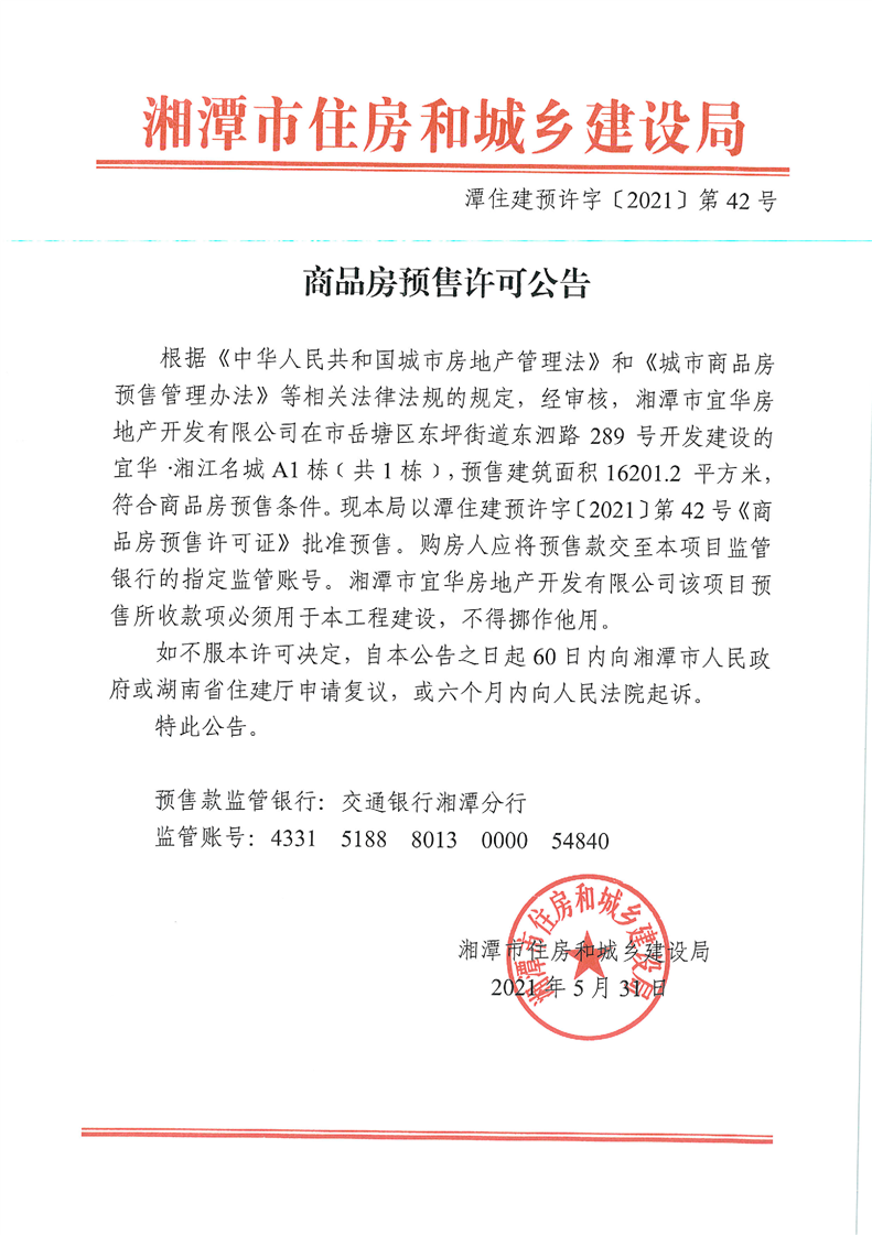 關(guān)于宜華·湘江名城A1棟(共1棟)預(yù)售許可公告