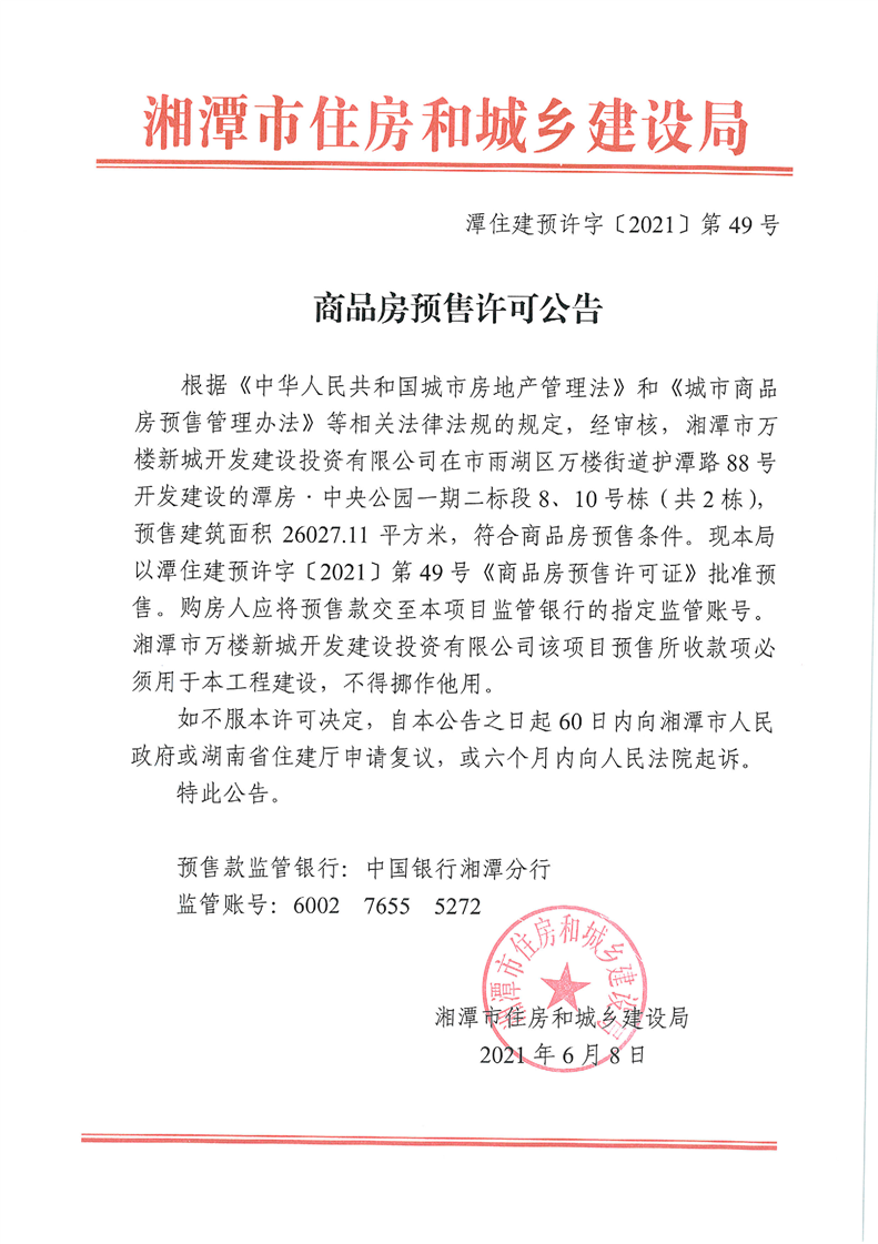 關(guān)于潭房·中央公園一期二標(biāo)段8、10號(hào)棟(共2棟)預(yù)售許可公告