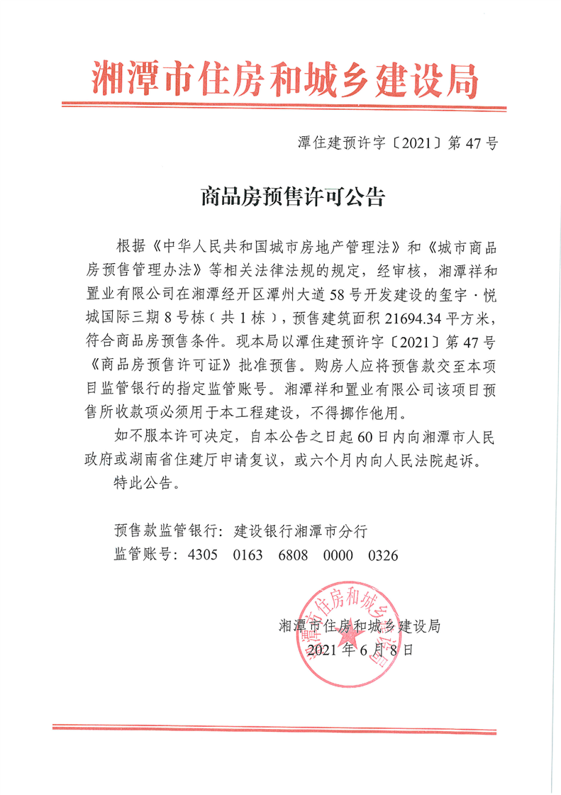 關(guān)于璽宇·悅城國際三期8號棟(共1棟)預(yù)售許可公告