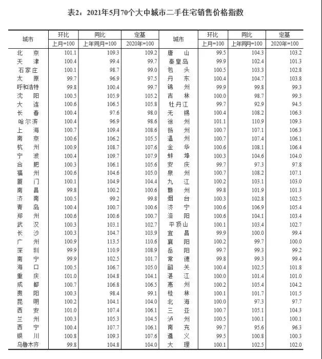 2021年5月70個(gè)大中城市二手住宅銷售價(jià)格指數(shù)。截圖自國家統(tǒng)計(jì)局官網(wǎng)