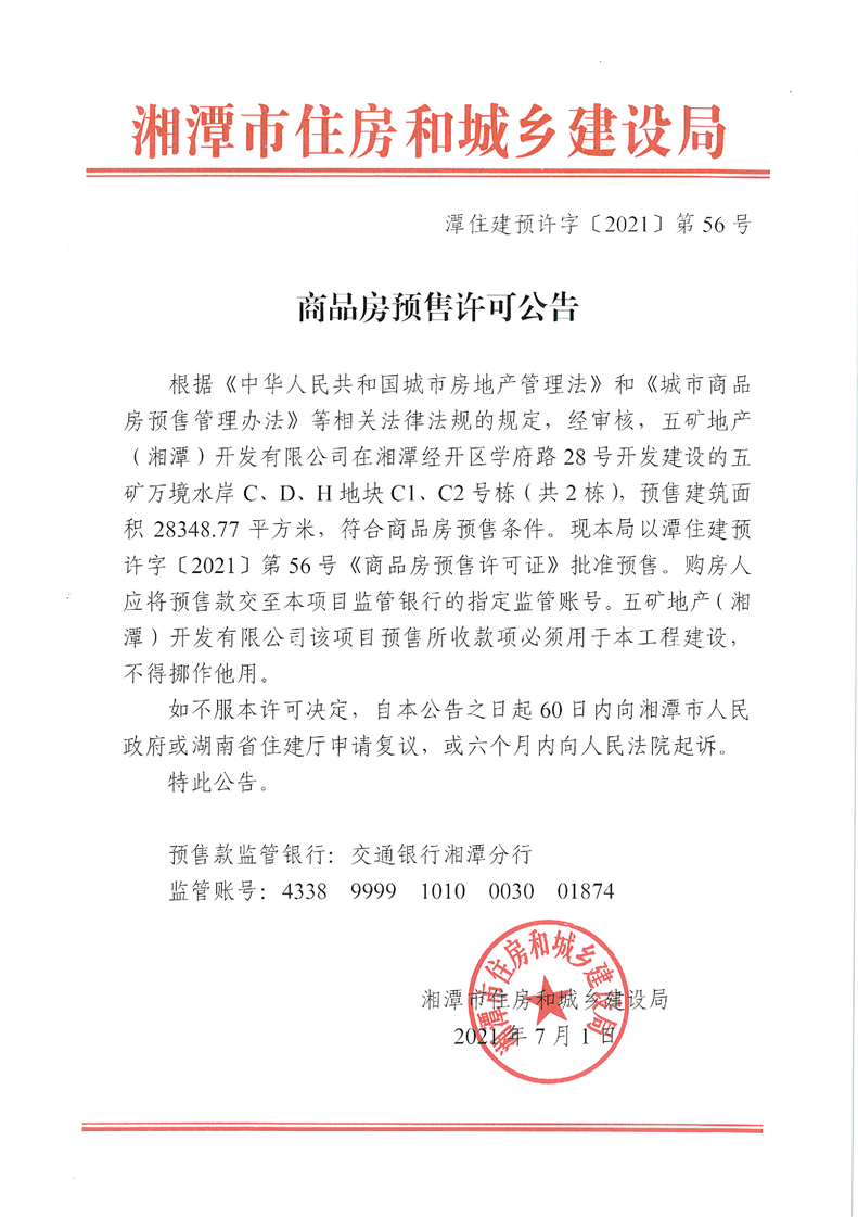 關(guān)于五礦萬境水岸C、D、H地塊C1、C2號棟(共2棟)預(yù)售許可公告