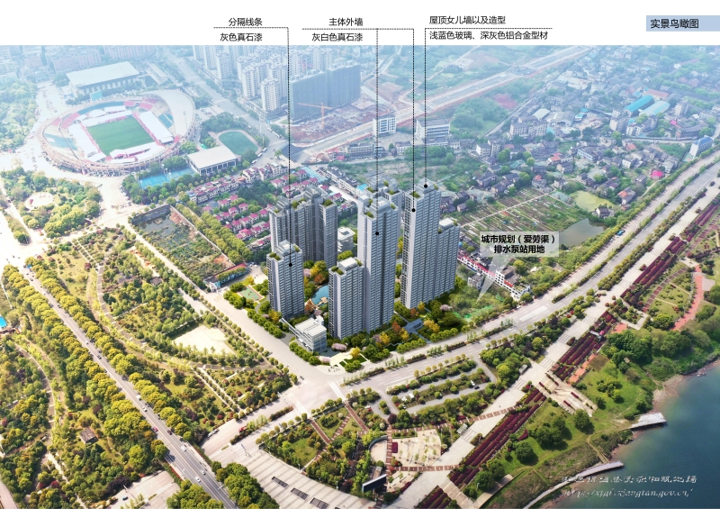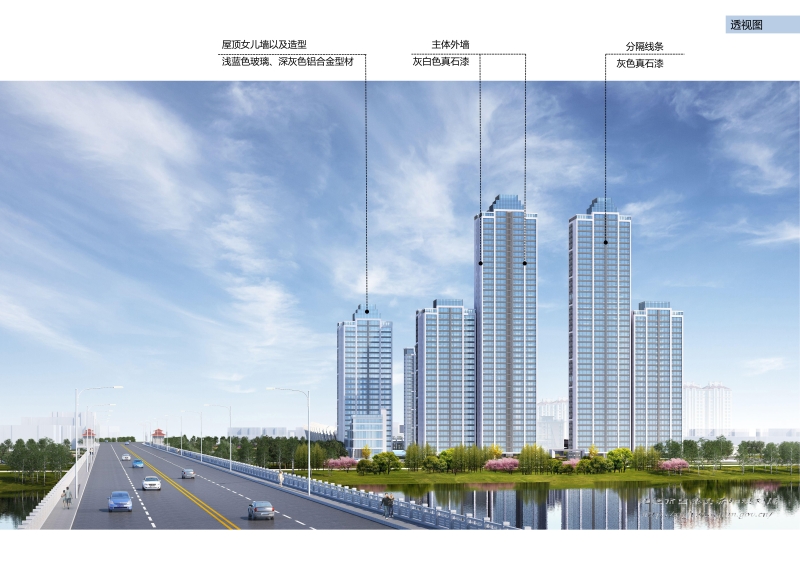 2.項目采用淺藍色玻璃、深灰色鋁合金型材,橫向線條為灰色真石漆,縱向線子為淺灰白色真石漆,以淺灰白色和淺藍色玻璃為主色調(diào),以豎向線條為主與橫向線條為輔的設(shè)計手法,塑造了高低錯落的臨江城市界面。