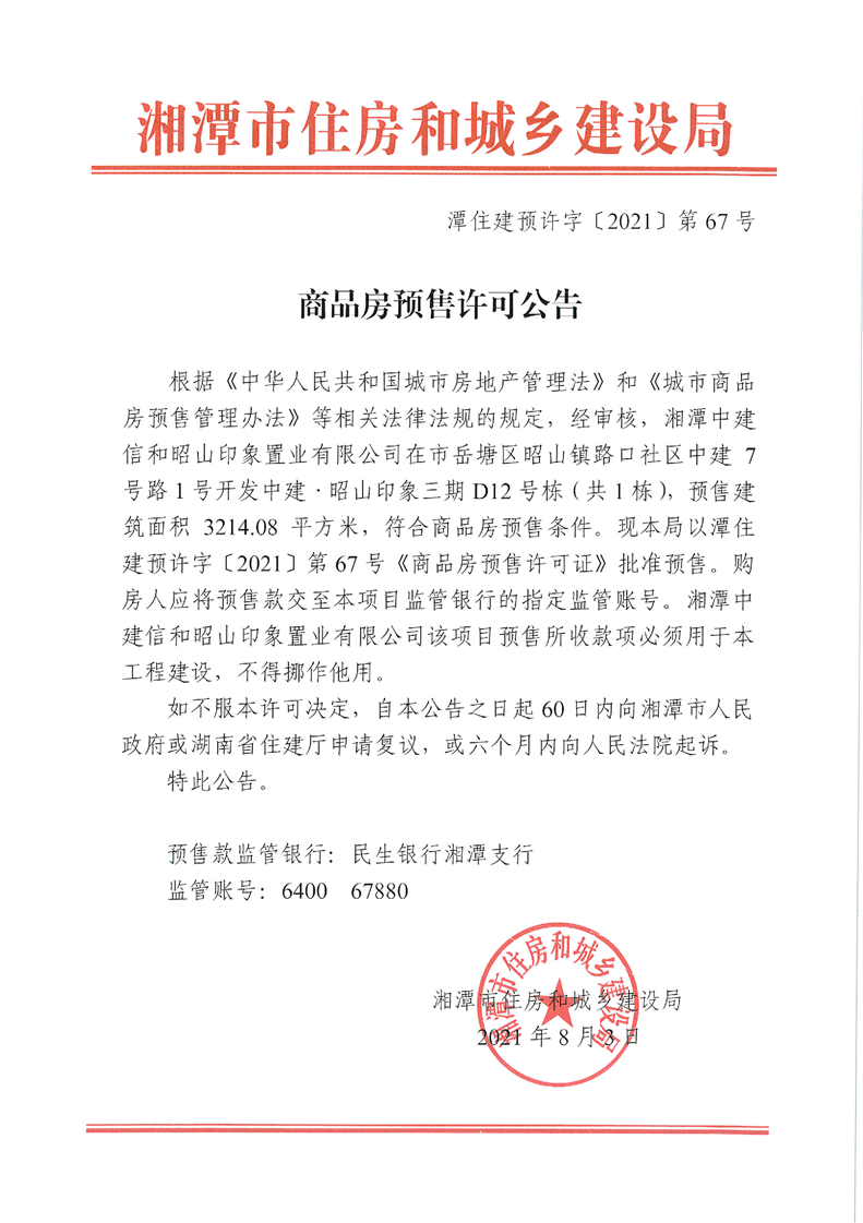 關(guān)于中建·昭山印象三期D12號(hào)棟(共1棟)預(yù)售許可公告