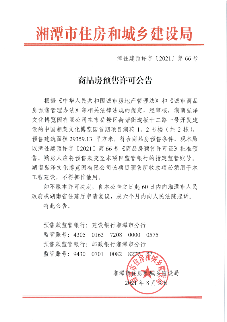 關(guān)于中國湘菜文化博覽園首期項目湖苑1、2號棟(共2棟)預(yù)售許可公告