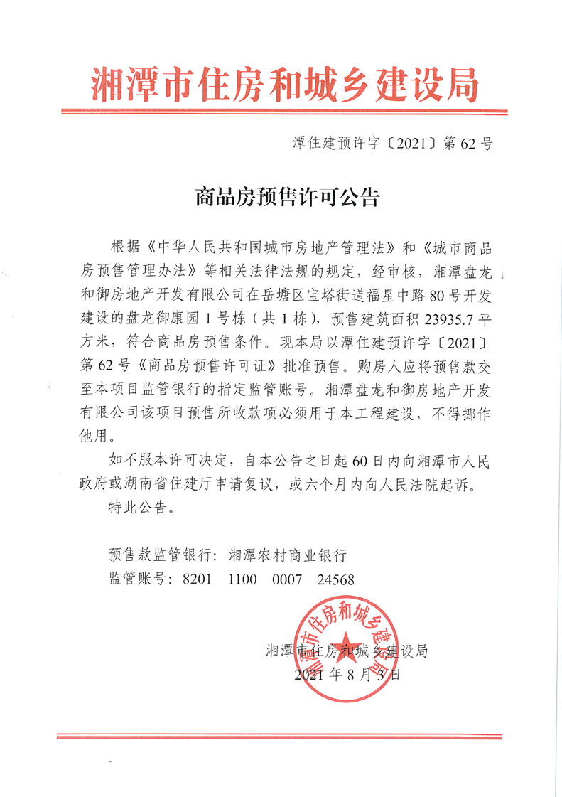 關(guān)于盤龍御康園1號(hào)棟(共1棟)預(yù)售許可公告