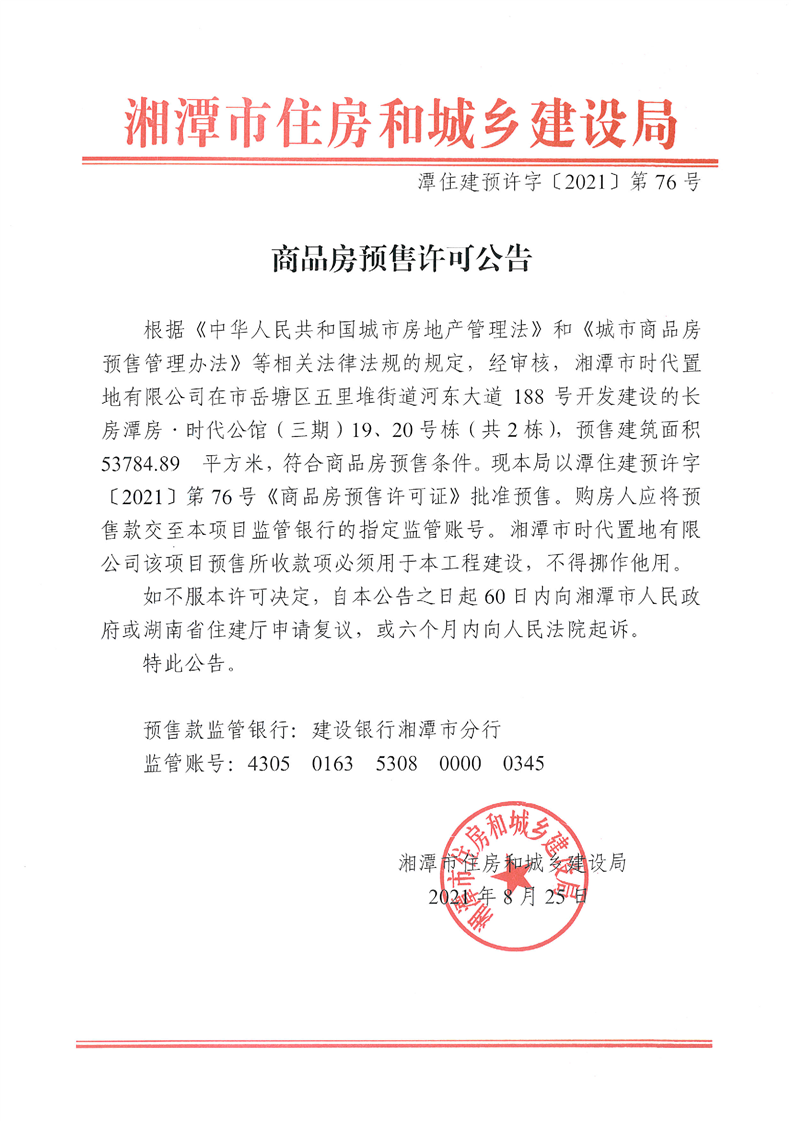 關(guān)于潭房·時代公館(三期)9、20號棟(共2棟)預(yù)售許可公告