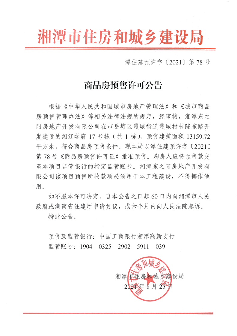 關(guān)于湘江學府17號棟(共1棟)預售許可公告