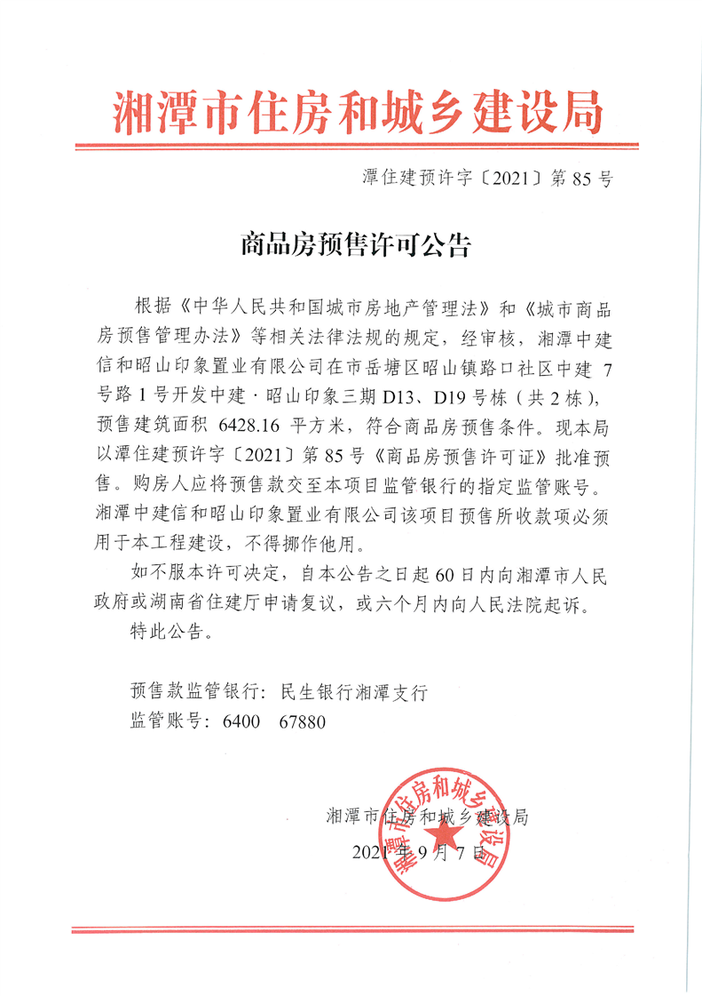 關(guān)于中建·昭山印象三期D13、D19號(hào)棟(共2棟)預(yù)售許可公告