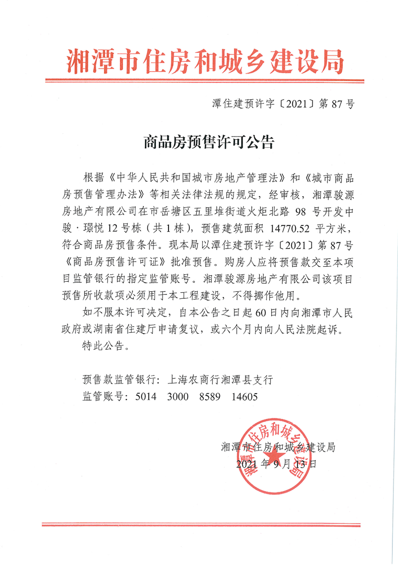 關(guān)于中駿·璟悅12號棟(共1棟)預(yù)售許可公告
