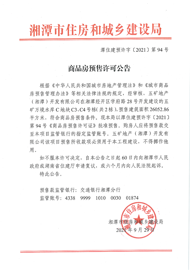 關(guān)于五礦萬(wàn)境水岸C地塊C3、C4號(hào)棟(共2棟)預(yù)售許可公告