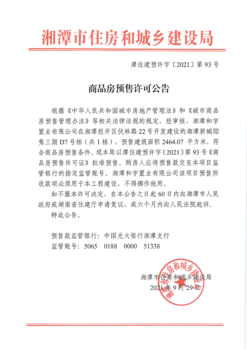 關(guān)于湘潭新城璟雋三期D7棟(共1棟)預(yù)售許可公告