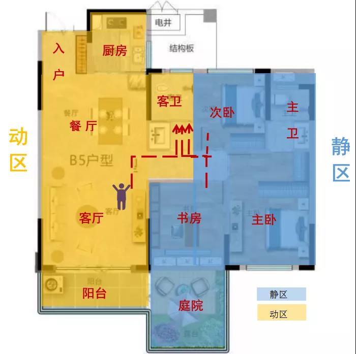 圖為環(huán)球港B5戶型動(dòng)靜分區(qū)、動(dòng)線合理示意