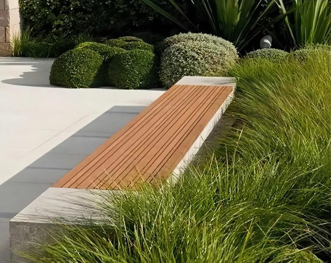 戶外園林采用木頭和石頭兩種材質(zhì)的座椅。