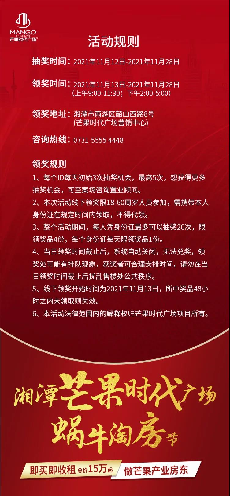 全民抽一抽 | 20萬豪禮免費拿,11月12-28日湘潭芒果時代廣場蝸牛淘房節(jié)福利大派送!!