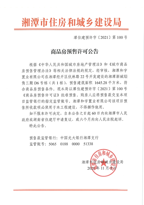 關(guān)于湘潭新城璟雋三期D6號棟(共1棟)預售許可公告