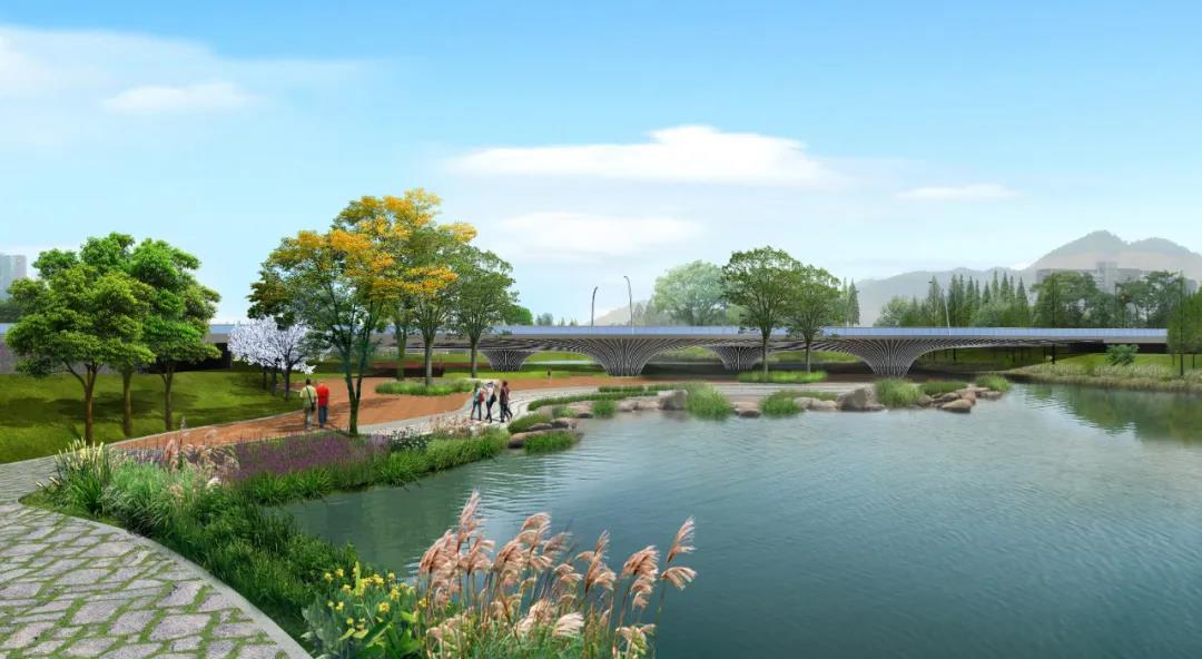 融合“引水筑網(wǎng),水綠融城”的湘潭城市濱水新概念,湘潭二級渠景觀帶東起沿江路、西至江南大道,全長2700米,是萬樓新城“兩心、三帶、四區(qū)”重要的水系綠帶。它連通著五個“島嶼”節(jié)點,通過景觀的交織、河流的融匯,構(gòu)建出清新而悠揚的自然曲調(diào),從而給予城市更多的細(xì)節(jié)與活力。