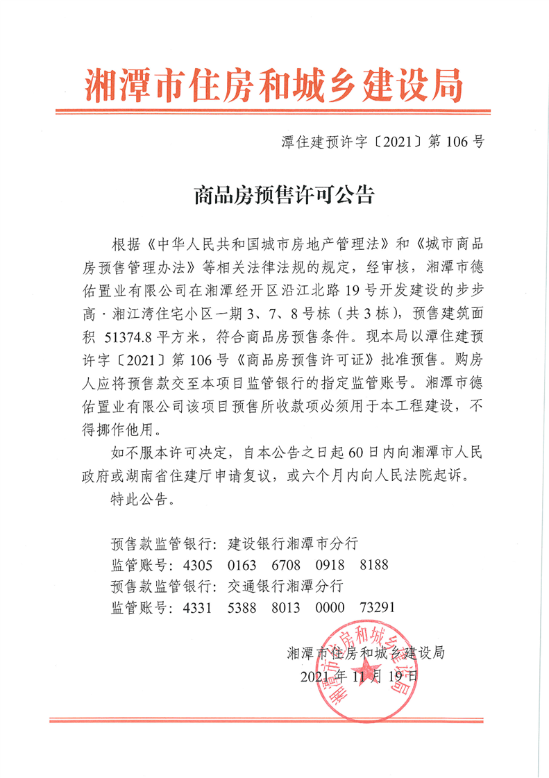 關(guān)于步步高·湘江灣住宅小區(qū)一期3、7、8號(hào)棟(共3棟)預(yù)售許可公告