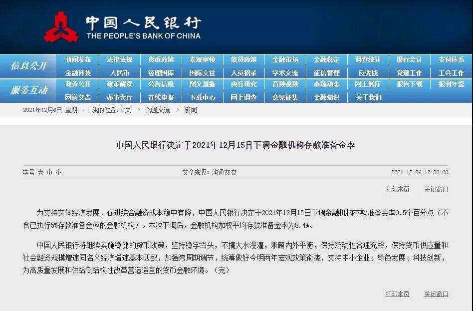 湘潭房產(chǎn)網(wǎng)12月8日訊 12月6日下午5點(diǎn)整,中國人民銀行網(wǎng)站發(fā)布公告稱,決定于2021年12月15日下調(diào)金融機(jī)構(gòu)存款準(zhǔn)備金率0.5個(gè)百分點(diǎn)(不含已執(zhí)行5%存款準(zhǔn)備金率的金融機(jī)構(gòu))。