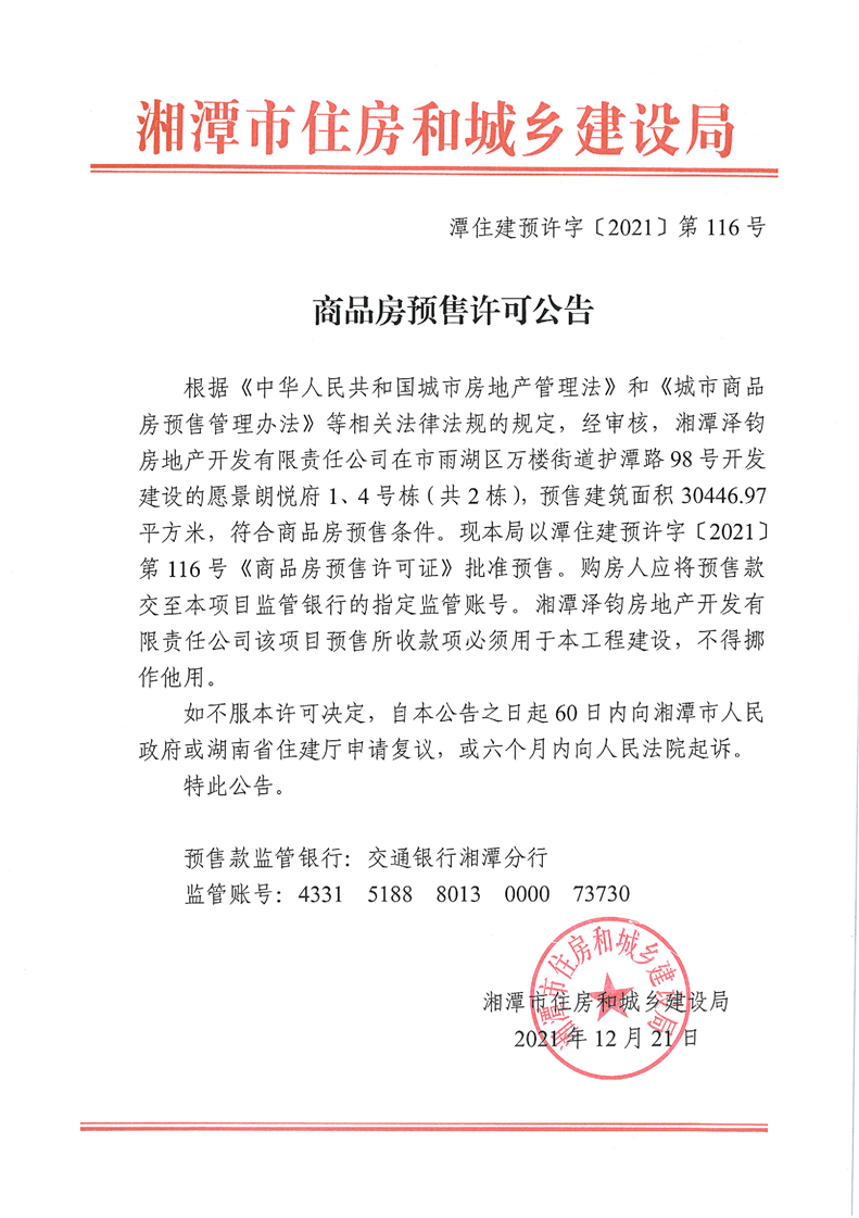 關于愿景朗悅府1、4號棟(共2棟)預售許可公告