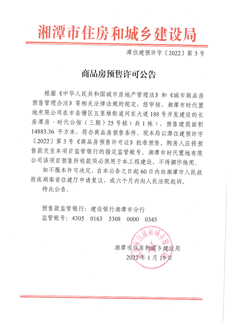 關(guān)于長房·潭房時代公館(三期)25號棟(共1棟)預(yù)售許可公告