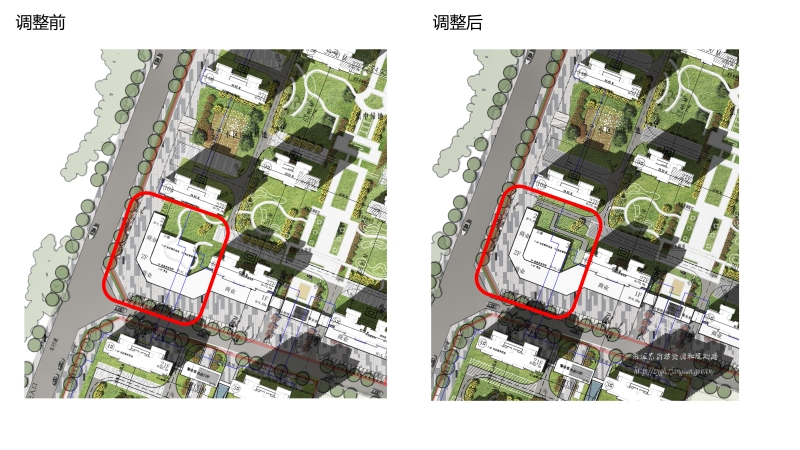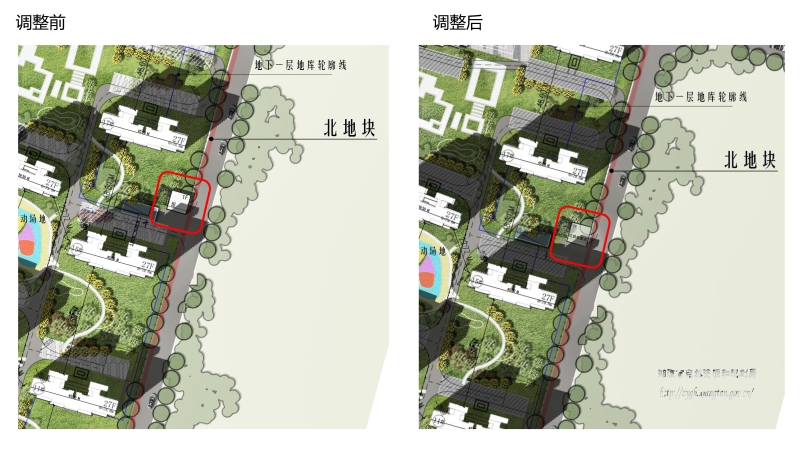 新增車道及消防登高操作場地移動導(dǎo)致綠化率北地塊由41.41%變更為40.32%,南地塊由36.52%變更為36.48 %,均滿足規(guī)劃條件要求(≥35%),其他經(jīng)濟指標(biāo)均不改變。