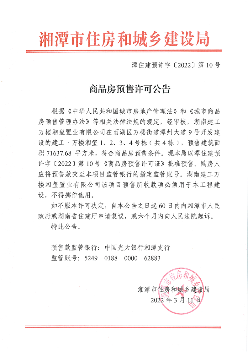關于建工萬樓·湘璽1、2、3、4號棟(共4棟)預售許可公告