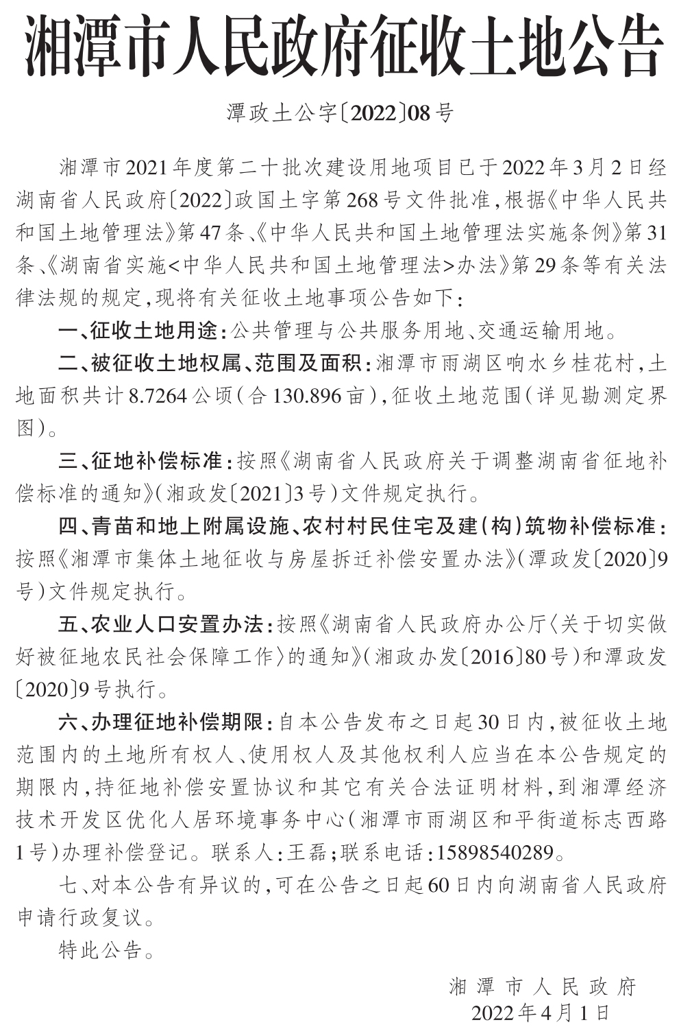 湘潭市2021年度第二十批次建設(shè)用地 征收土地公告 潭政土公字〔2022〕08號