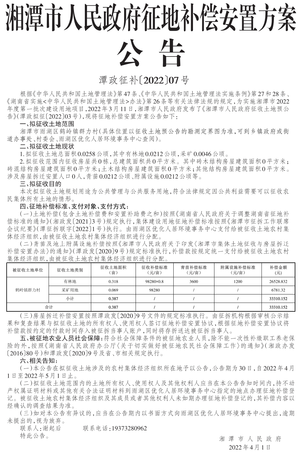 征地補(bǔ)償安置公告 潭政征補(bǔ)〔2022〕07號 湘潭市2022年度第一批次建設(shè)用地