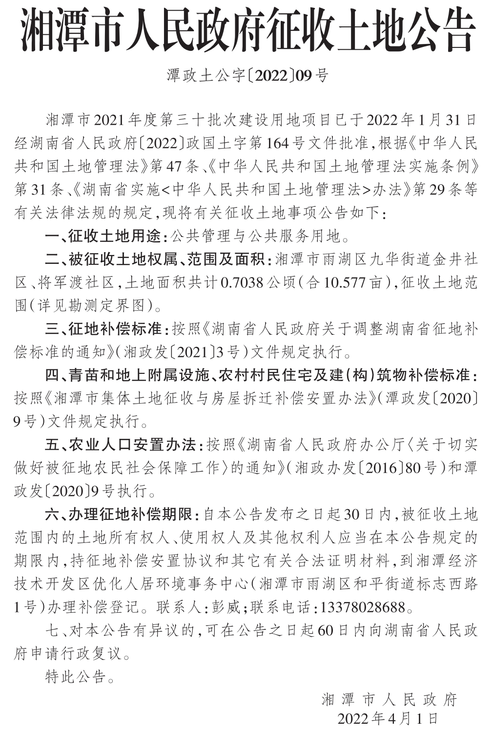 湘潭市2021年度第三十批次建設(shè)用地 征收土地公告 潭政土公字〔2022〕09號