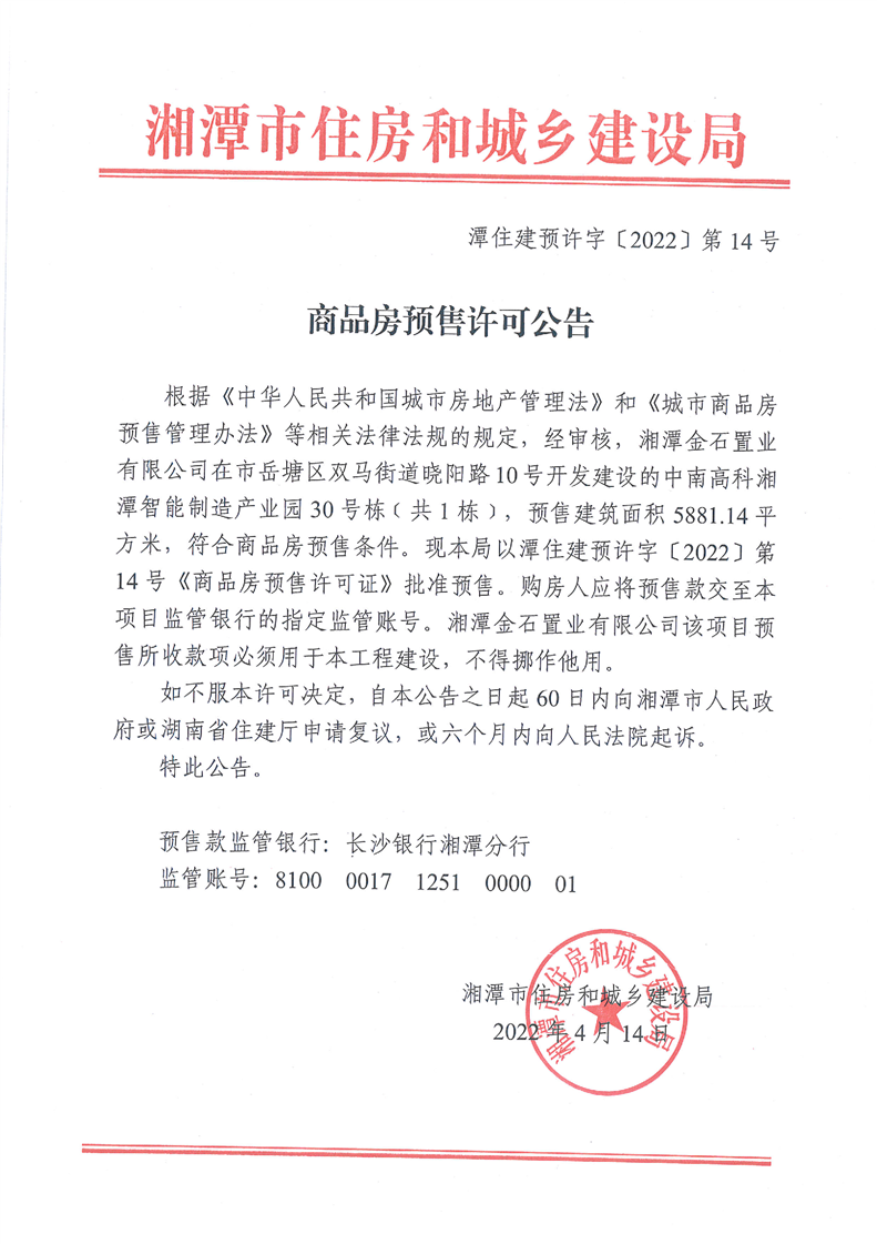 關(guān)于中南高科湘潭智能制造產(chǎn)業(yè)園30號棟(共1棟)預(yù)售許可公告