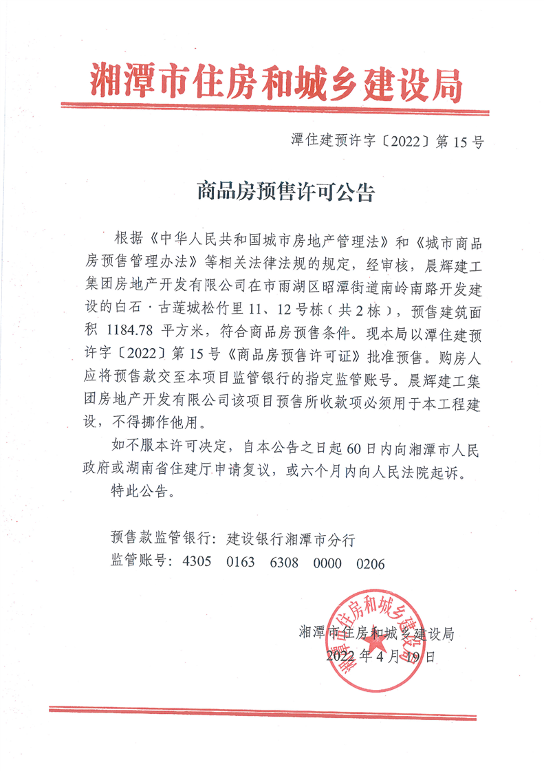 關(guān)于白石•古蓮城松竹里11、12號棟(共2棟)預(yù)售許可公告