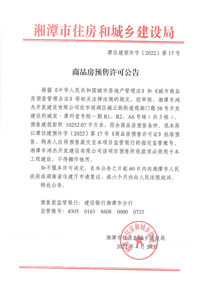 關(guān)于城發(fā)·潭州壹號院一期R1、R2、A6號棟(共3棟)預(yù)售許可公告