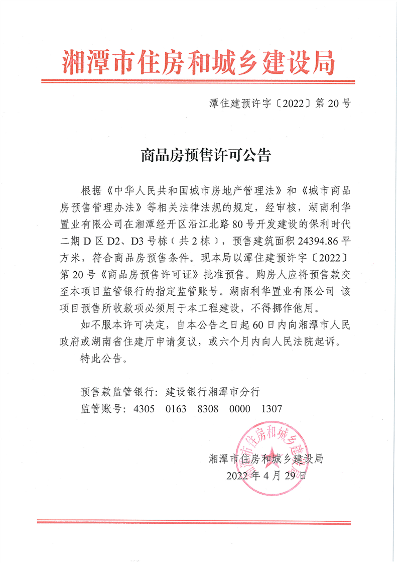關(guān)于保利時(shí)代二期D區(qū)D2、D3號棟(共2棟)預(yù)售許可公告