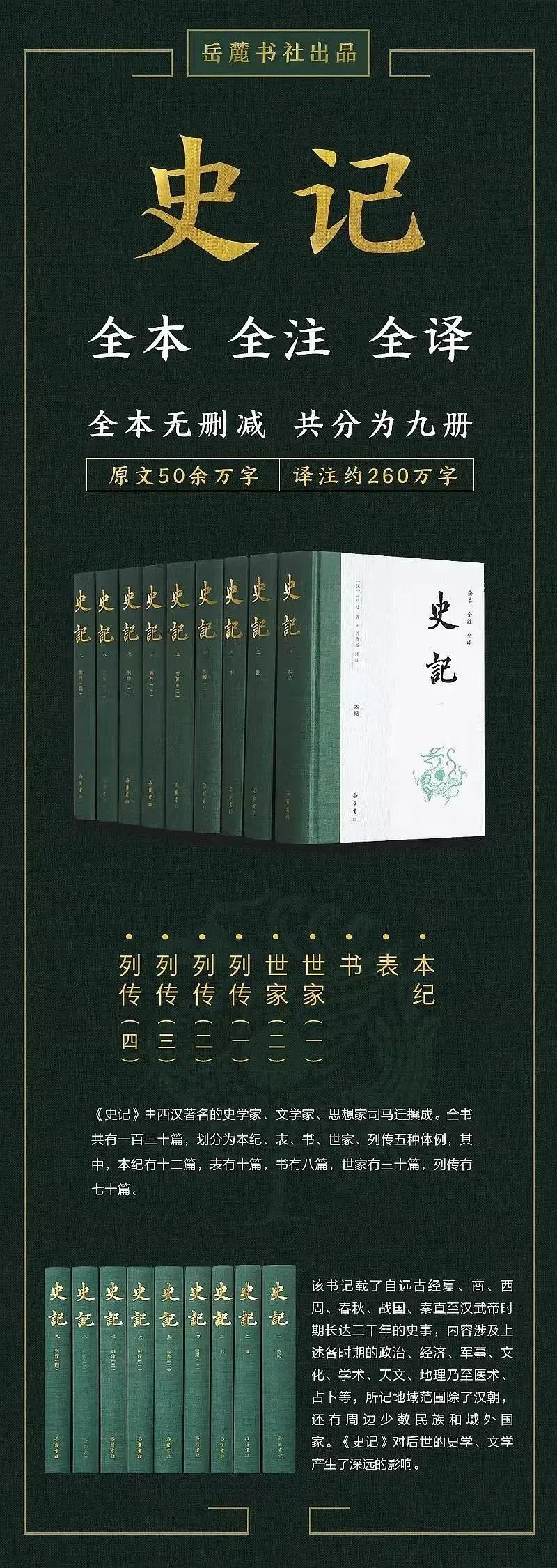 《史記》由西漢著名的史學家、文學家、思想家司馬遷撰成。被列為“二十四史”之首。記載了自遠古經(jīng)夏、商、西周、春秋、戰(zhàn)國、秦直至漢武帝時期長達三千年的史事,內(nèi)容涉及上述各時期的政治、經(jīng)濟、軍事、文化、學術、天文、地理乃至醫(yī)術、占卜等,被譽為“史家之絕唱,無韻之《離騷》”。對后世的史學、文學產(chǎn)生了深遠的影響。