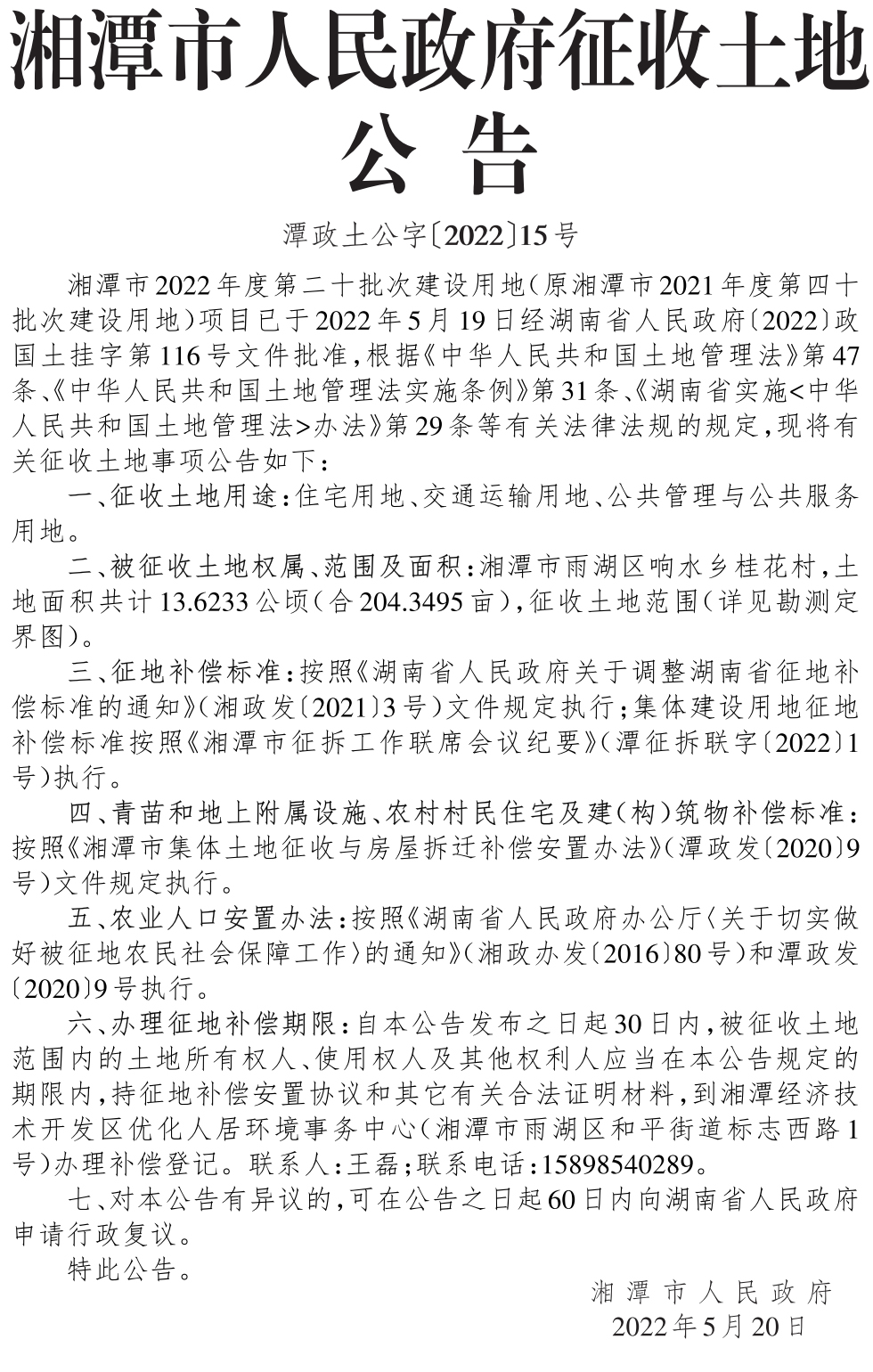 湘潭市2022年度第二十批次建設(shè)用地(原湘潭市2021年度第四十批次建設(shè)用地) 征收土地公告 潭政土公字〔2022〕15號