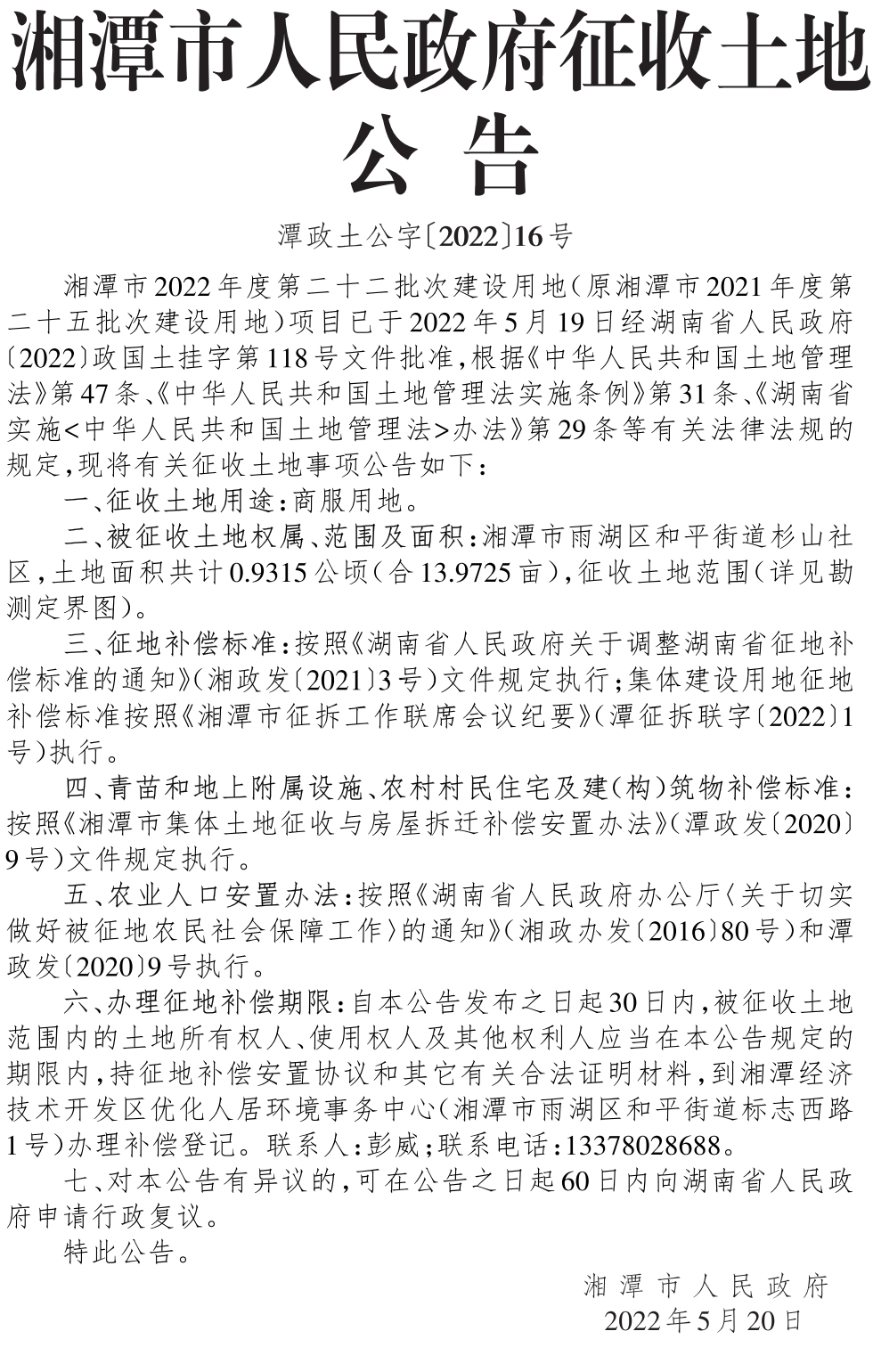湘潭市2022年度第二十二批次建設(shè)用地(原湘潭市2021年度第二十五批次建設(shè)用地) 征收土地公告 潭政土公字〔2022〕16號