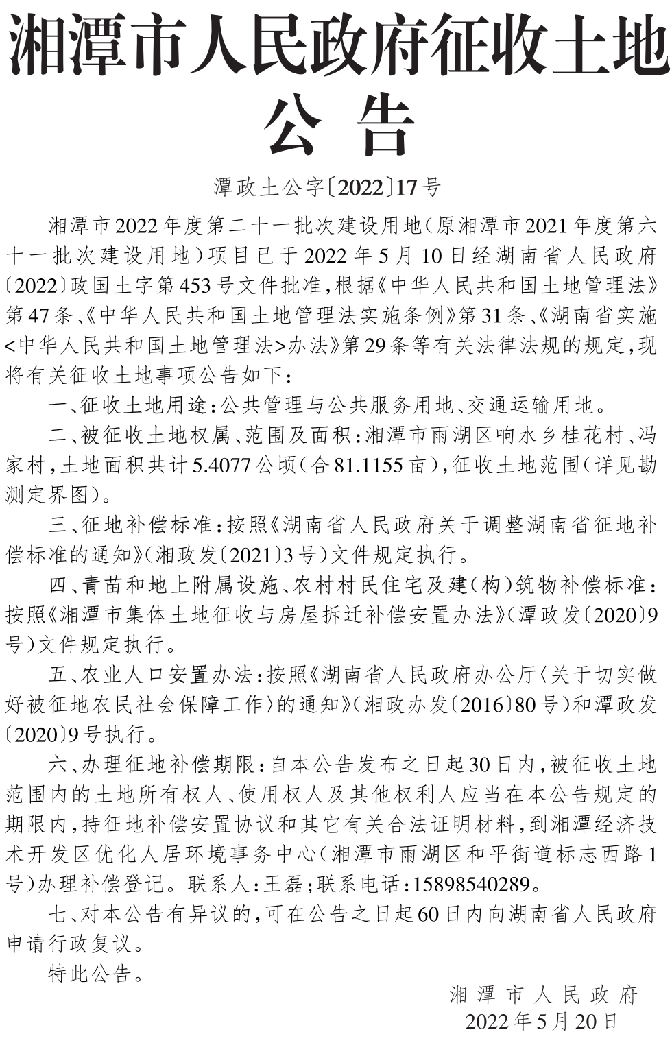 湘潭市2022年度第二十一批次建設(shè)用地(原湘潭市2021年度第六十一批次建設(shè)用地) 征收土地公告 潭政土公字〔2022〕17號