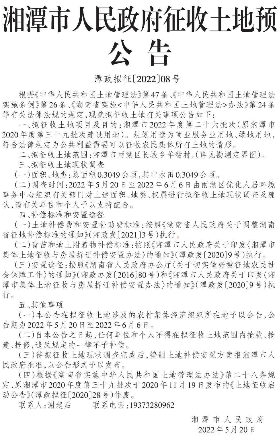 征收土地預(yù)公告 潭政擬征〔2022〕08號 湘潭市2022年度第二十六批次建設(shè)用地