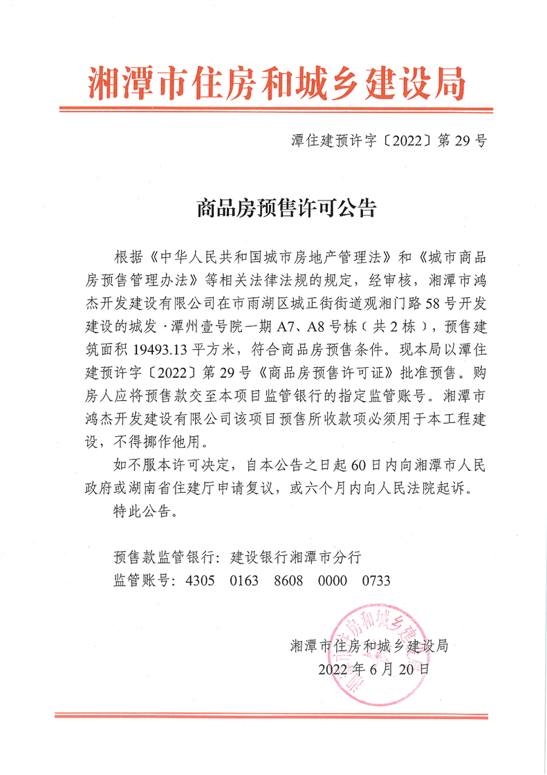 關(guān)于城發(fā)·潭州壹號(hào)院一期A7、A8號(hào)棟(共2棟)預(yù)售許可公告