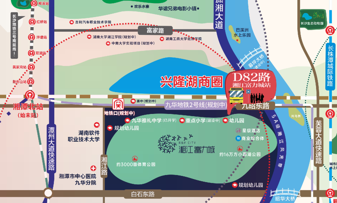規(guī)劃中,湘江富力城站點有望與地鐵3號線南延線湘潭北站接駁,這也意味著湘江富力城和各城市的聯(lián)系更加緊密,未來居住于此,優(yōu)享高速公交的紅利。