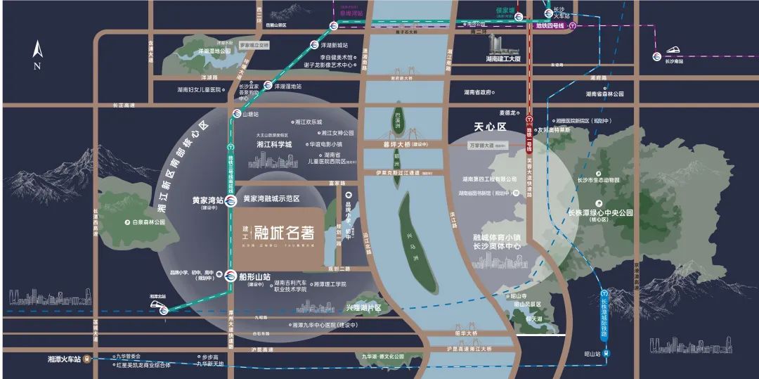 湖南建工·融城名著地處長沙地鐵3號線南延線黃家灣站&船形山站雙地鐵口,以黃家灣融城示范區(qū)為中心,湘江融城科技城、興隆湖片區(qū)、融城體育小鎮(zhèn)、四大戰(zhàn)略規(guī)劃環(huán)伺,眾星拱月,彰顯龍頭效應(yīng)。