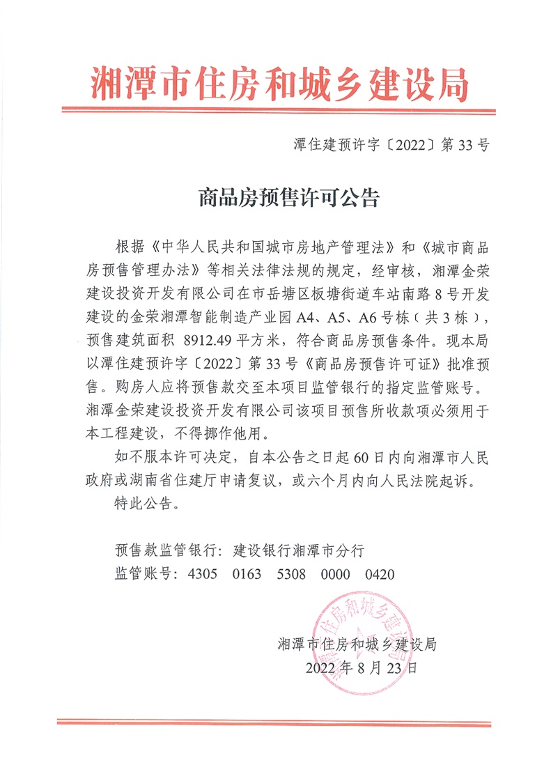 關(guān)于金榮湘潭智能制造產(chǎn)業(yè)園A4、A5、A6號棟(共3棟)預(yù)售許可公告
