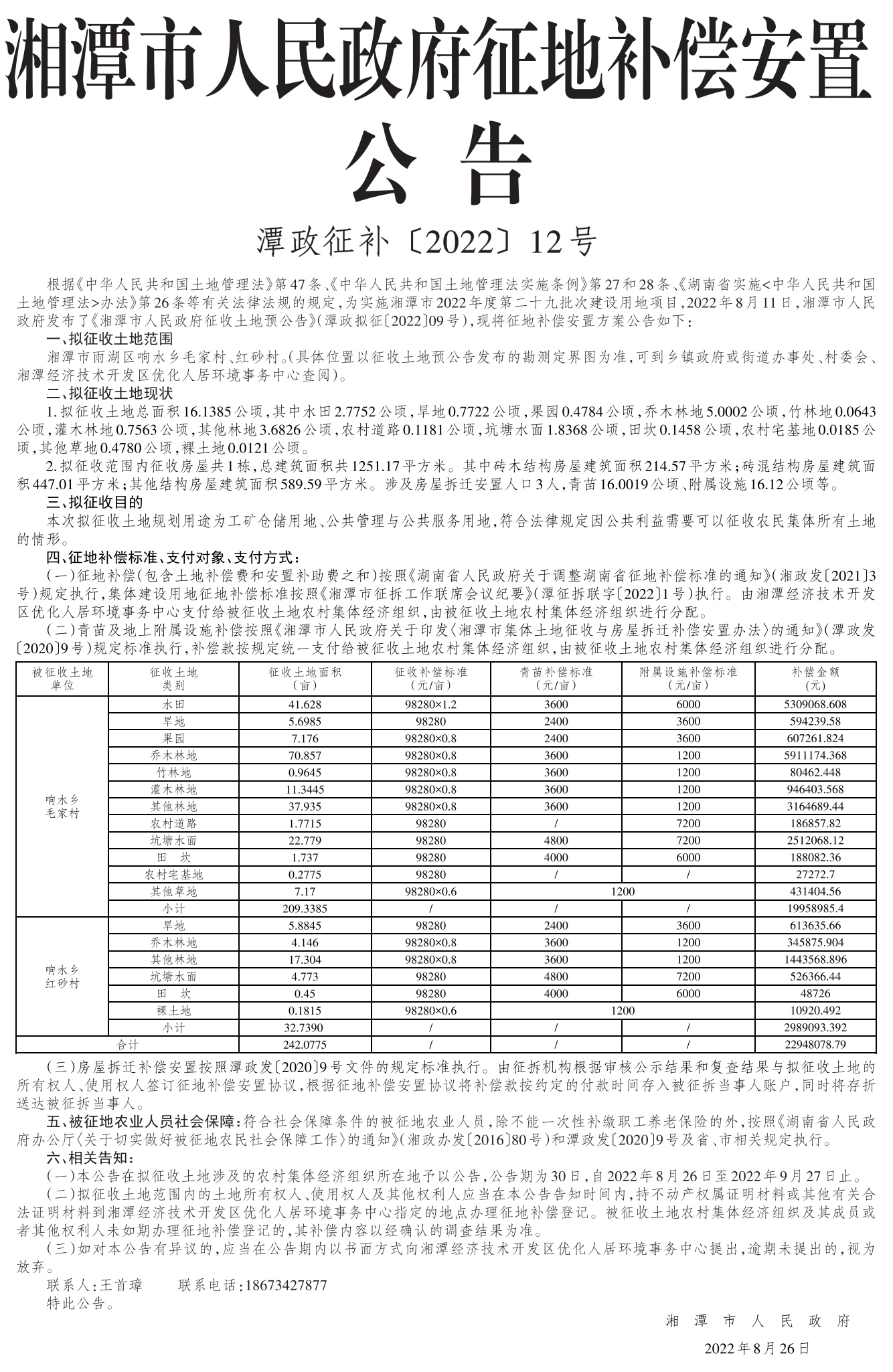 征地補償安置方案公告 潭政征補〔2022〕12號 湘潭市2022年度第二十九批次建設用地