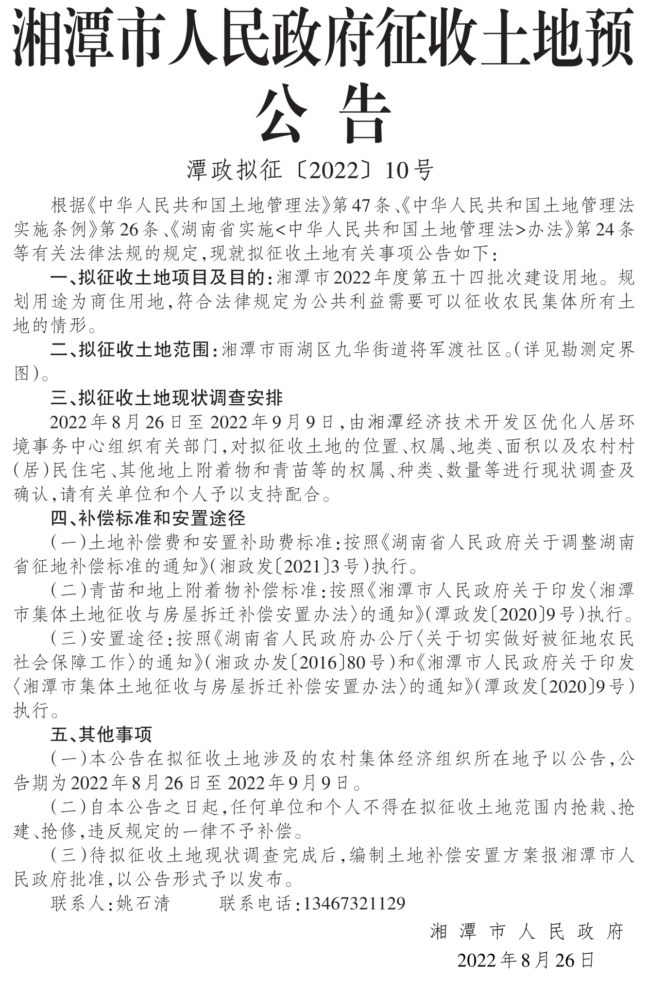 征收土地預公告 潭政擬征〔2022〕10號 湘潭市2022年度第五十四批次建設用地