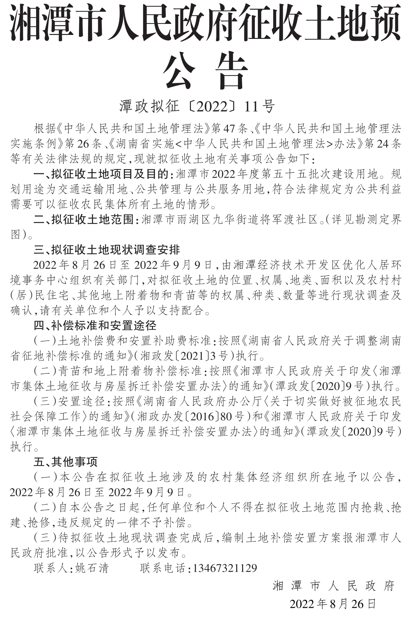 征收土地預公告 潭政擬征〔2022〕11號 湘潭市2022年度第五十五批次建設用地